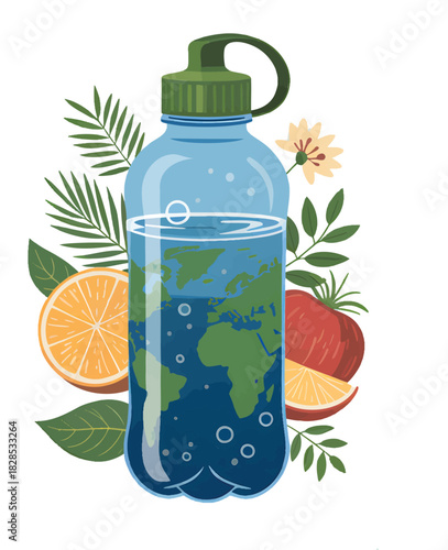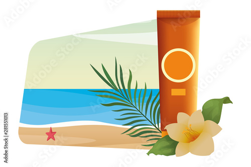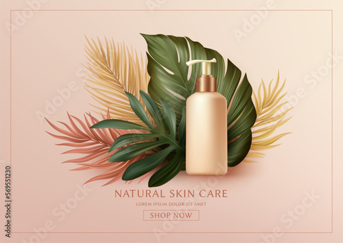 Белый пустой косметический флакон на круглом подиуме витрины, вырезанные из бумаги экзотические цветы, листья пальмы, векторная иллюстрация. Тропический цветочный фон для рекламы косметических средств.