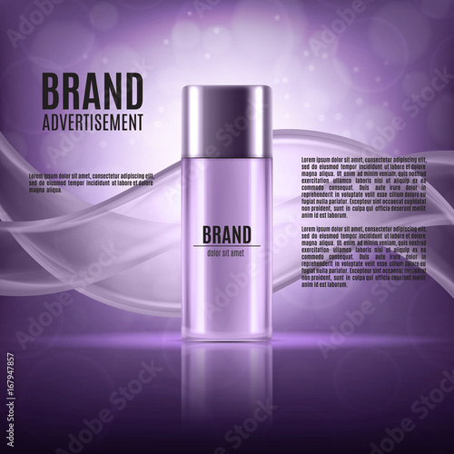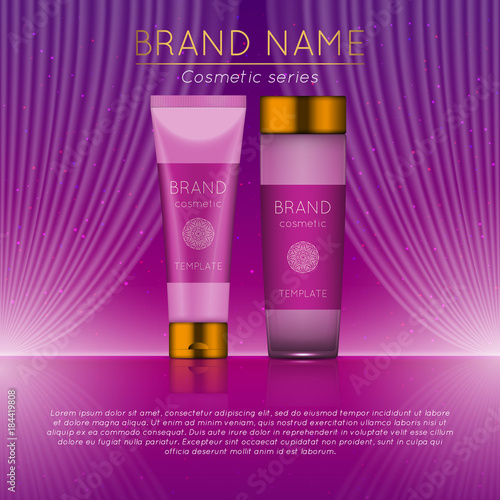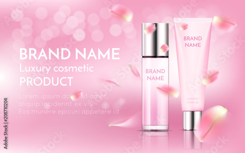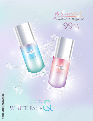 Реклама косметических средств. Векторная 3d иллюстрация. Дизайн шаблона флакона для ухода за кожей. Крем и лосьон для макияжа лица и тела.