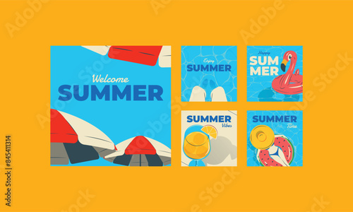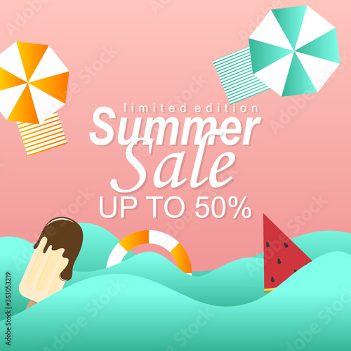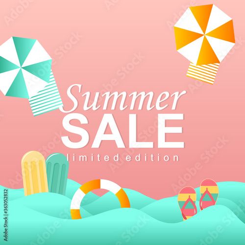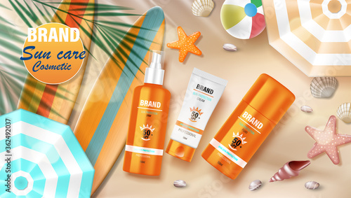 Оранжевые макеты косметических тюбиков, вырезанный из бумаги тропический пляж в стиле ремесла, зонтики от солнца, листья растений, векторная иллюстрация. Солнцезащитный косметический продукт, шаблон рекламы крема для защиты от солнечных ожогов.