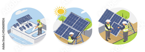 Этапы строительства коттеджа. Векторная изометрическая иллюстрация градуировки участка, водопровода и канализации, установки фундамента, кровли, укладки пленки, обрамления, облицовки, окон и дверей и готового дома.