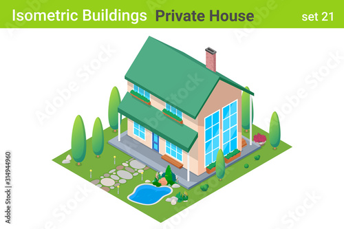 Набор векторных плоских изометрических горизонтальных баннеров для строительства коттеджа. Установка фундамента, Обрамление и кровля, Готовые к перемещению элементы концептуального дизайна, шаблоны веб-сайтов.