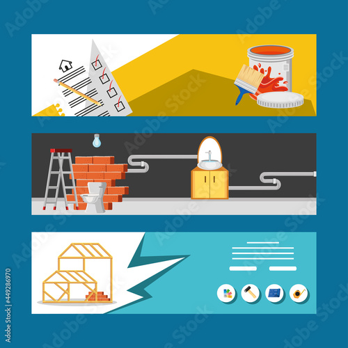Векторный плоский изометрический плакат для строительства коттеджа, набор баннеров. Элементы дизайна фундамента, каркаса, кровли, окон и дверей.