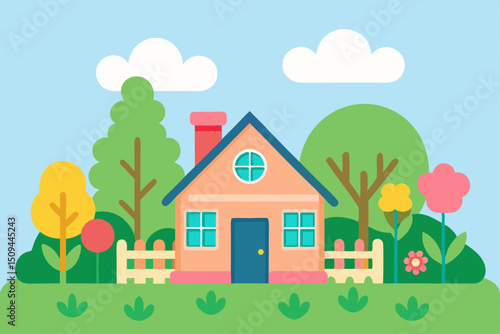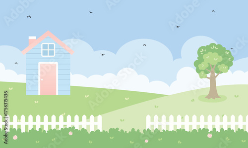 Загородный дом, концепция посадки овощей векторная иллюстрация в плоском стиле. Садовники возделывают землю, копают, удобряют почву садовыми инструментами, поливают цветы.