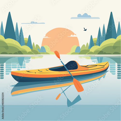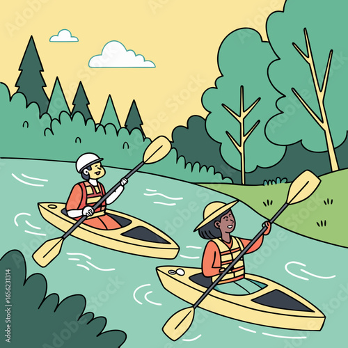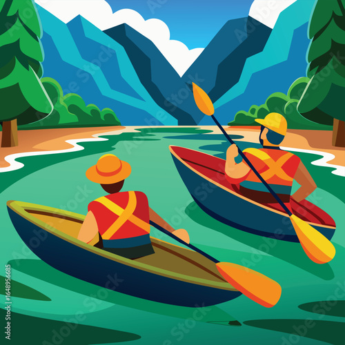 Пара на байдарке спускается к реке на закате. Набор векторных плакатов для водных видов спорта с приключениями. Мужчина и женщина занимаются рафтингом, каякингом, греблей на каноэ, держат весла. Природный ландшафт.