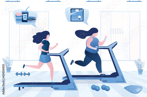 Пара, бегущая по беговым дорожкам, плоская векторная иллюстрация. Фитнес-зал, тренировка на беговой дорожке, здоровый образ жизни, спортивный инвентарь.