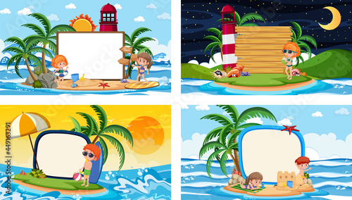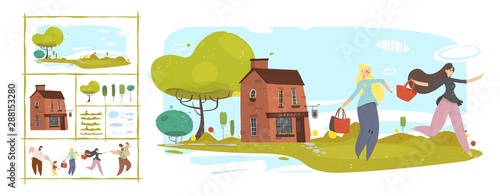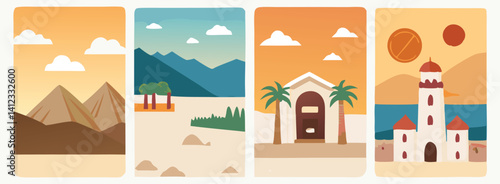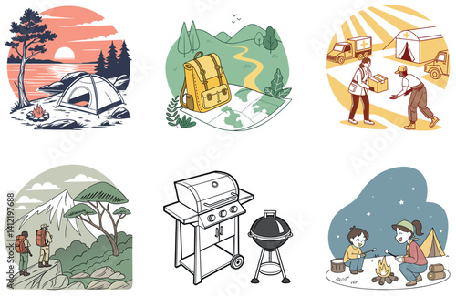 Пара сидит рядом с походной палаткой и смотрит на звездную ночь. Набор векторных плакатов для каникул в летнем лагере. Горный и лесной пейзаж с палатками. Снаряжение для кемпинга. Приключения, природа, костер.
