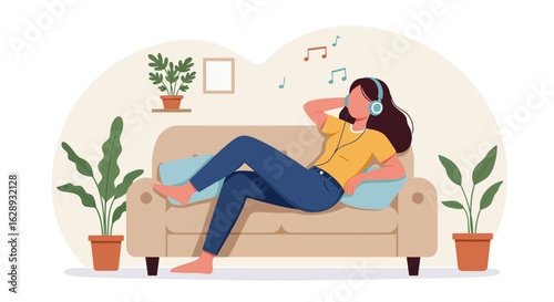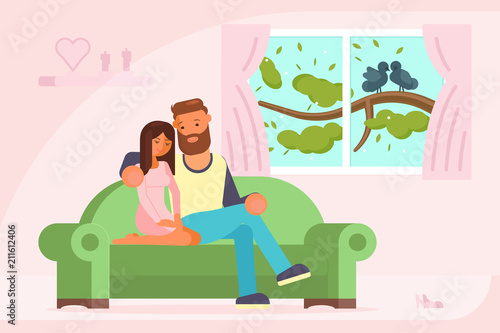 Векторная иллюстрация молодой пары, разговаривающей друг с другом, сидя на диване в гостиной. Дизайн в плоском стиле.