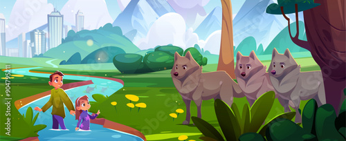 Пара совершает поход в горы и пересекает реку. Векторный плакат концепции путешествий и походов. Мужчина и женщина с рюкзаком на открытом природном ландшафте.