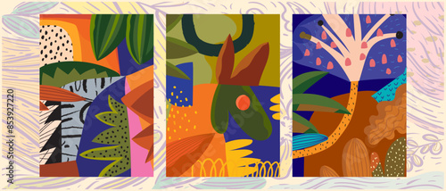 Пара отправилась в поход в горы. Набор векторных плакатов о путешествиях, приключениях и пешем туризме. Люди взбираются на гору. Мужчина и женщина с рюкзаком на открытом природном ландшафте. Треккинговый ботинок крупным планом.