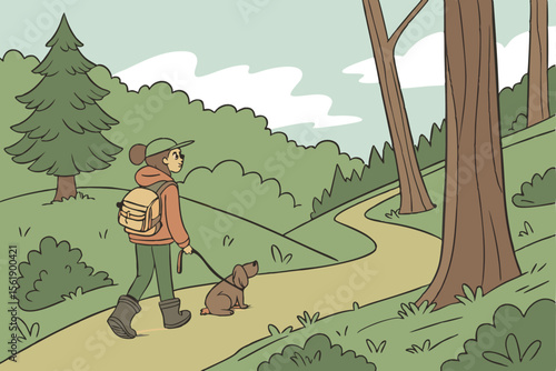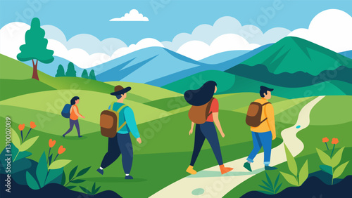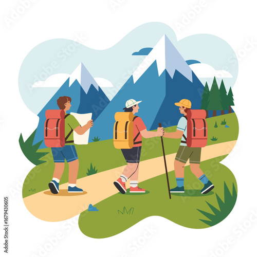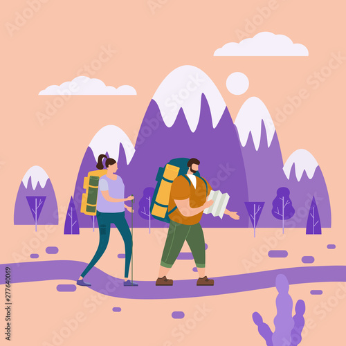 Пара с гидом совершают поход в горы. Векторный плакат концепции путешествий и походов. Люди взбираются на гору. Мужчина и женщина с рюкзаком на открытом природном ландшафте.