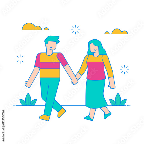 Счастливая пара с протезами ног и рук, наслаждающаяся полной жизнью, идущая вместе, плоская векторная иллюстрация. Образ жизни людей с ограниченными возможностями, отношения с ограниченными возможностями, романтическое свидание.