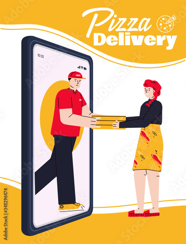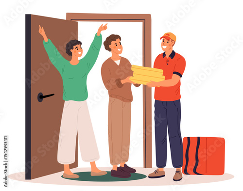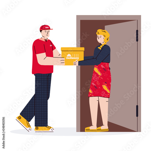 Курьер, курьер в маске для лица, доставляющий продукты питания к двери дома, дающий сумку с продуктами женщине-клиенту, плоская векторная иллюстрация. Услуги доставки на дом во время пандемии коронавируса covid-19.