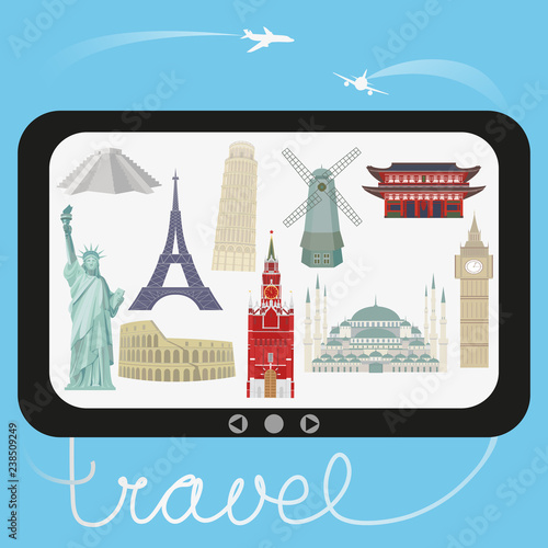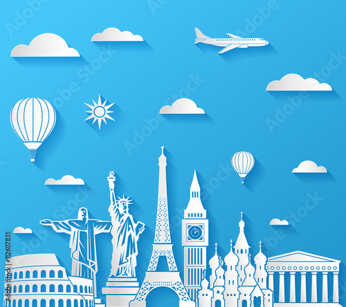 Всемирно известные достопримечательности, чемодан с проездным билетом и QR-кодом вакцины против COVID-19, векторная иллюстрация в стиле бумажного искусства. Правила и ограничения поездок по Covid-19, карантинные требования.