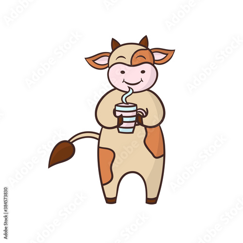 Вектор коробки tetra pack с молоком для коровы. Забавная счастливая улыбка мультяшного персонажа-талисмана фермерского животного со свежим молочным напитком, изолированным на белом фоне