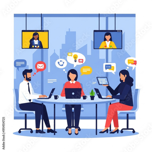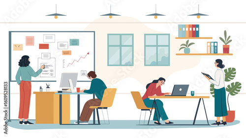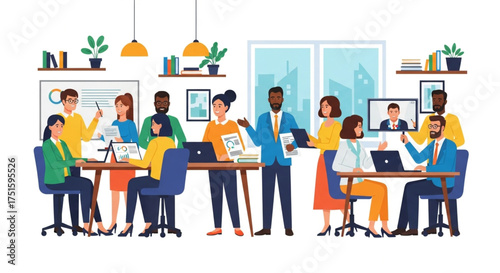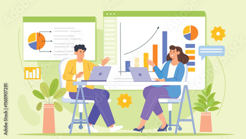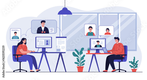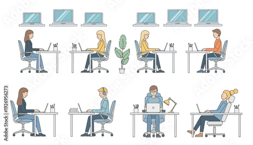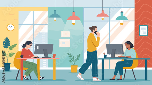 Векторная иллюстрация концепции коворкинг-центра. Рабочее пространство, молодые люди, использующие ноутбуки и наушники. Элементы дизайна в плоском стиле.