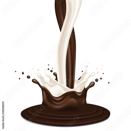 Реалистичная векторная иконка с треснувшим кокосовым орехом и заливкой растопленным шоколадом. Элемент дизайна для сладких изделий, выделенный на белом фоне