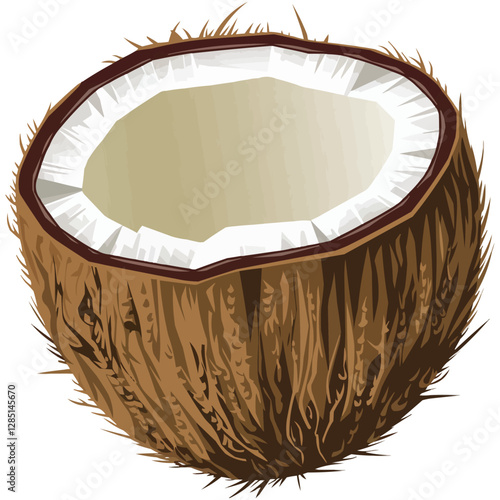 Треснувшая скорлупа кокосового ореха в виде реалистичной векторной иконки "всплеск молочного коктейля". Элемент дизайна для сладких продуктов, выделенный на белом фоне