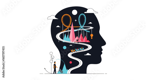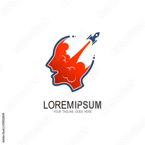 Силуэт человеческой головы с ракетой, планетами, облаками, векторная иллюстрация в стиле бумажного искусства. Концепция творческого мышления для веб-баннера, страницы веб-сайта, плаката и т.д.