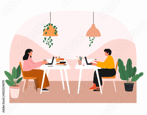 Творческий кризис. Грустная, растерянная, усталая женщина, писатель, сидящий за столом с чистым листом бумаги на нем, плоская векторная иллюстрация. Творческий кризис и эмоциональное выгорание, депрессия, психический стресс.