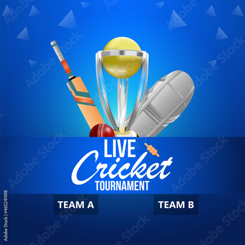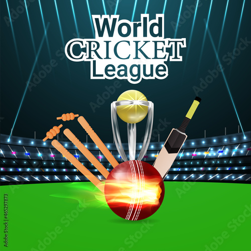 Векторный плакат события чемпионата по крикету, шаблон дизайна баннера. Оборудование для игры в крикет и защитное снаряжение. Реалистичная бита, шлем, щитки для отбивающих ног или подушечки, мяч, культя, кубок победителя и текст.