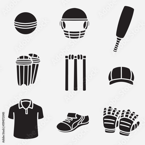 Набор для игры в крикет, векторная изолированная иллюстрация. Снаряжение игрока в крикет и защитное снаряжение. Реалистичная бита, перчатки, шлем, защитные накладки для ног, мяч, культя, чашка, спортивная сумка.