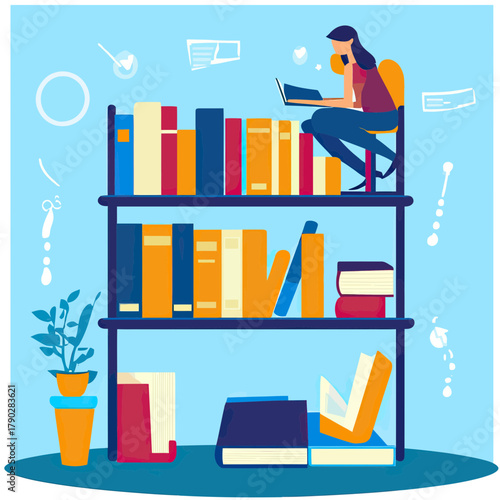Векторная иллюстрация дизайна в плоском стиле концепции кроссбукинга. Разнообразие людей, читающих книги, сидя и лежа на книжных полках. Библиотека для обмена книгами и приятного времяпрепровождения.
