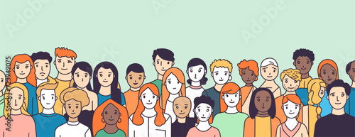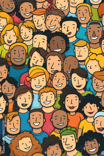 Толпа разнообразных многонациональных людей мужского и женского пола, головы которых смотрят вверх, демонстрируя различные эмоции на лице, векторная иллюстрация бесшовного узора