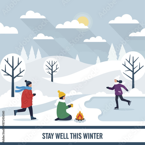 Толпа людей, проводящих время в векторной иллюстрации зимнего парка. Пара, родитель с детьми, персонажи гуляют, лепят снеговика, несут рождественскую елку, катаются на коньках вместе