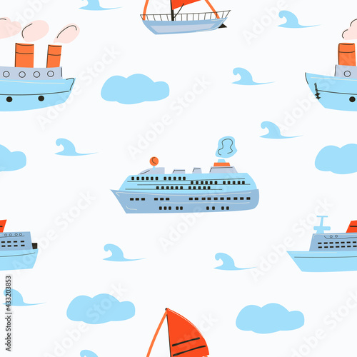 Векторный горизонтальный баннер круизного лайнера. Туристический плакат с большим пассажирским круизным лайнером, плывущим по воде, городским пейзажем и местом для текста. Плоский дизайн в линейном стиле.