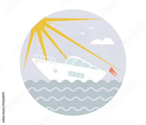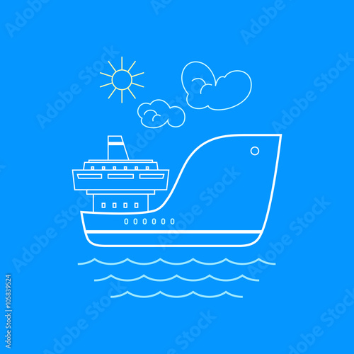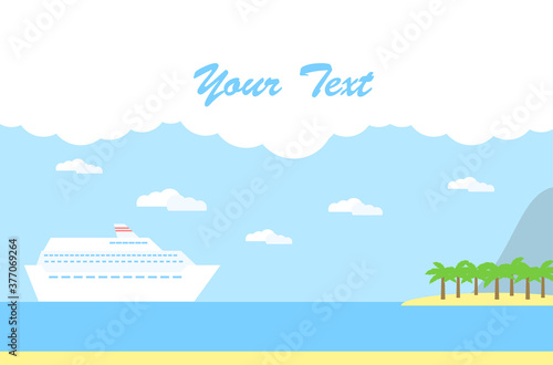 Векторная иллюстрация, вырезанная из бумаги во время круиза. Круизный лайнер, плывущий по океанским волнам, дельфины, чайки, острова, туристические курорты. Морское путешествие, летний круиз.