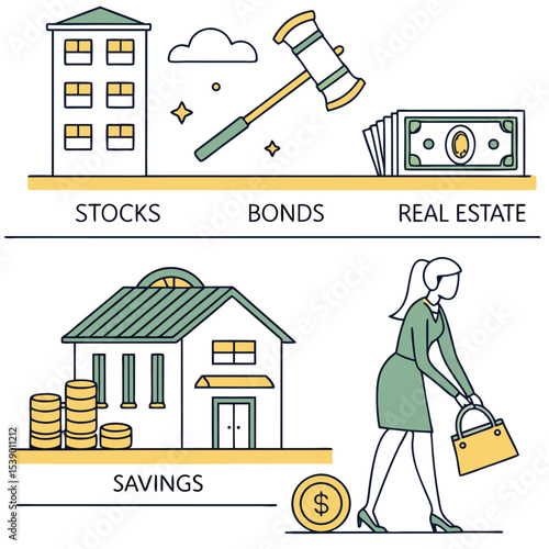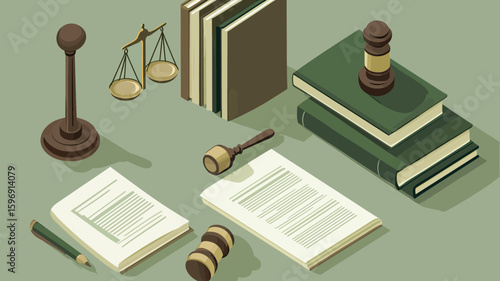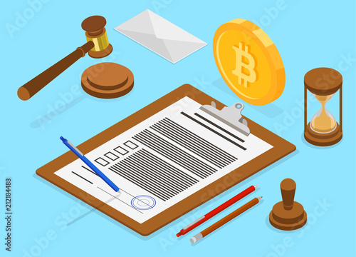 Законы и нормативные акты по крипто-майнингу, векторная иллюстрация. Изометрический биткоин, серверные стойки и юридические символы, книга законов, весы правосудия, молоток судьи. Законодательство о криптовалютах.