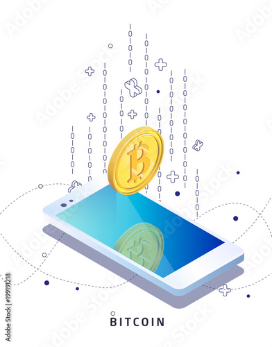 Концепция криптовалюты и блокчейн-технологии. Обмен фиатных денег на биткоин с помощью мобильного телефона. Безопасный цифровой платеж. Векторный шаблон дизайна веб-сайта. Иллюстрация концепции сайта целевой страницы.