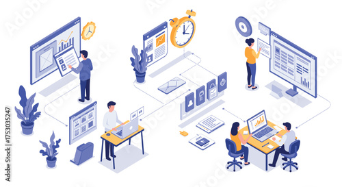 Блок-схема жизни криптовалюты с майнингом биткоина, удержанием, фондовой биржей и ICO. Векторная изометрическая иллюстрация.