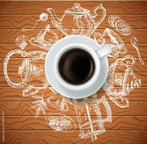 Векторная реалистичная чашка черного чая с видом сверху с нарисованными от руки каракулями вокруг нее на фоне дерева. Эскиз старинного чайного сервиза.