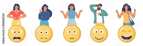 Клиенты выбирают сердитые, счастливые, грустные смайлики, чтобы поделиться своими отзывами, плоская векторная иллюстрация. Люди с улыбками. Смайлики для обратной связи с пользователями. Рейтинг удовлетворенности клиентов.