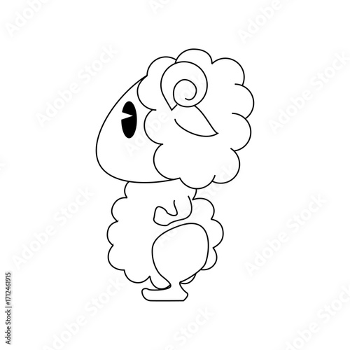 Симпатичный вектор альпаки. Забавный мультяшный значок стоящего ламы. Иллюстрация улыбающегося кавайного животного, вид сбоку. Счастливый талисман с пушистой вьющейся зеленой шерстью, выделенный на белом фоне