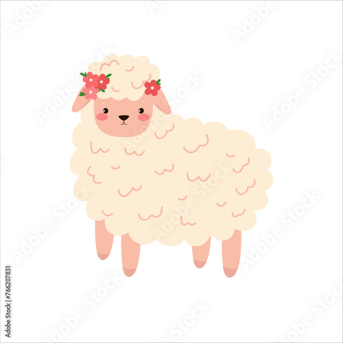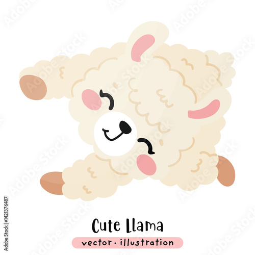 Симпатичный вектор альпаки. Забавный значок из мультфильма о ламе, гуляющем пешком. Кавайное животное улыбается и веселится на иллюстрации. Счастливый довольный талисман с пушистой вьющейся розовой шерстью, выделенный на белом фоне