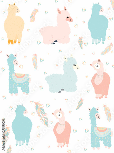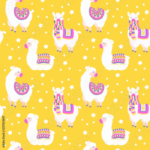 Симпатичные альпаки с кактусами и горами векторным бесшовным рисунком. Креативный дизайн для ткани, текстиля, обоев, оберточной бумаги.