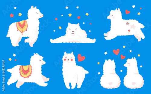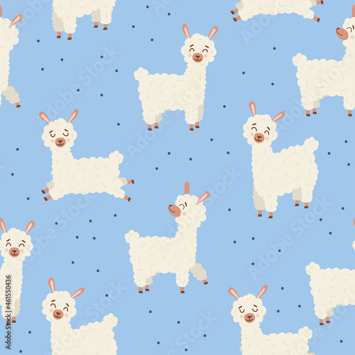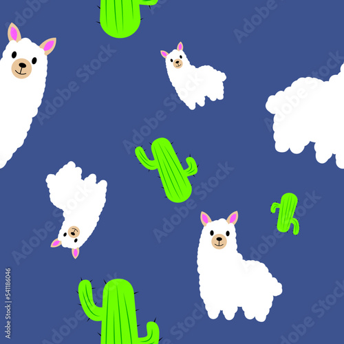 Симпатичные белые альпаки с белыми и розовыми шариками шерсти векторным бесшовным рисунком. Креативный дизайн для ткани, текстиля, обоев, оберточной бумаги.