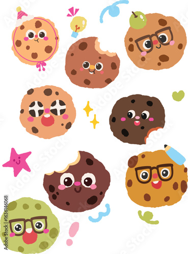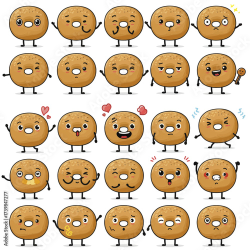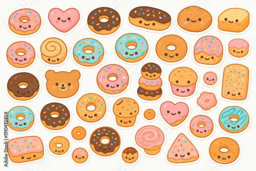 Милый и забавный набор символов для выпечки сладкого десерта, плоская векторная иллюстрация. Счастливый мультяшный торт, маффин, пончик, печенье, вафля, крендель, круассан, пирог с человеческими лицами. Выпечка, кондитерские изделия, хлебобулочные изделия.
