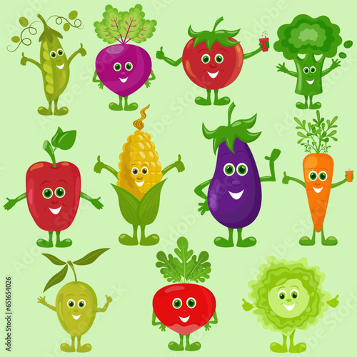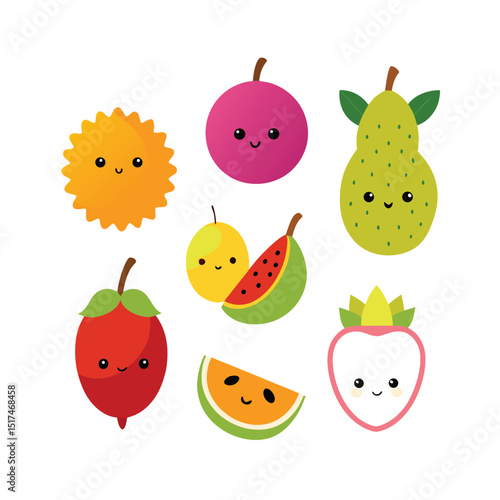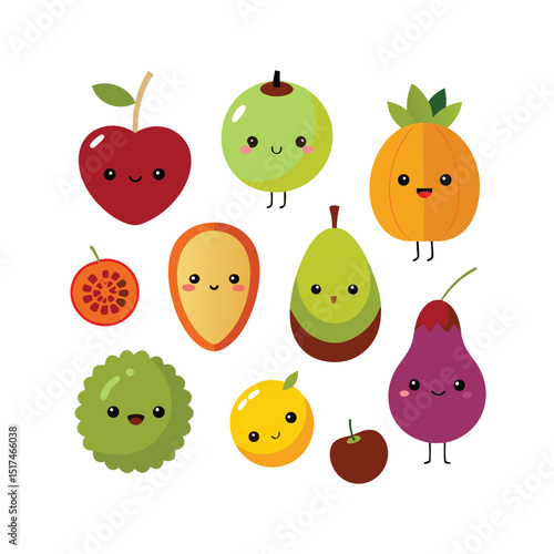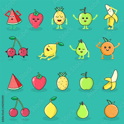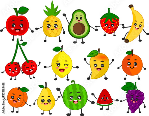 Милый и забавный набор фруктовых символов, плоская векторная иллюстрация. Летние фрукты и ягоды. Счастливый мультфильм вишня, арбуз, слива, банан, яблоко, лимон, груша, клубника, авокадо, ананас с лицами.