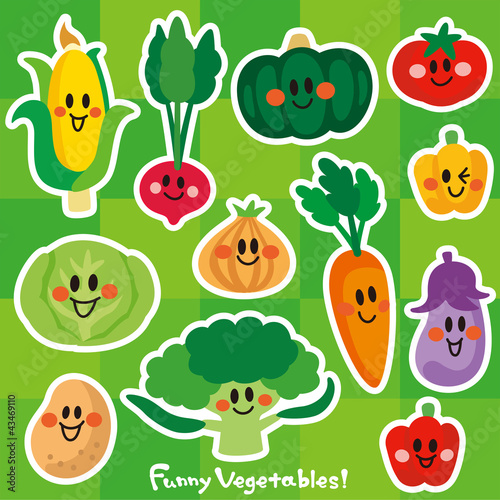 Милый и забавный набор символов овощей, плоская векторная иллюстрация. Веселый мультфильм кольраби, брокколи, сладкая кукуруза, лук, морковь, помидор, огурец, тыква, чеснок, красный перец с мордочками. Здоровая пища.