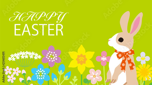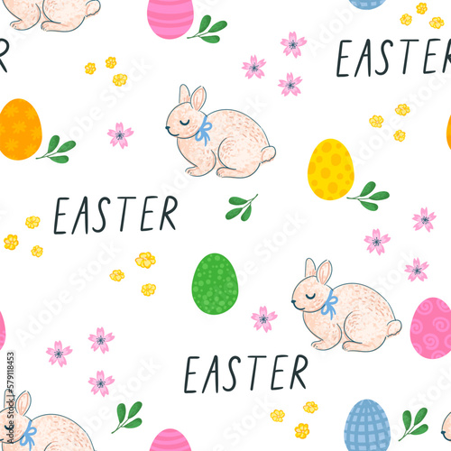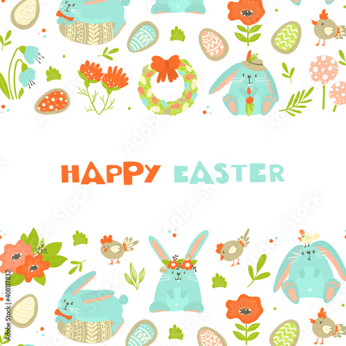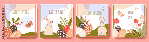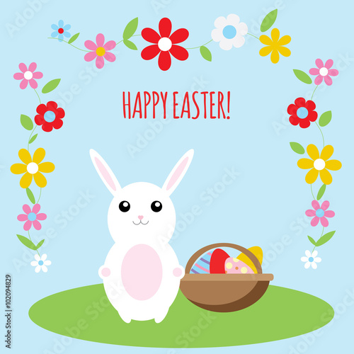 Милый кролик, пасхальные яйца, цветы и конверт с письмом, векторная иллюстрация в стиле бумажного искусства. Поздравительная открытка с Пасхой, шаблон плаката.