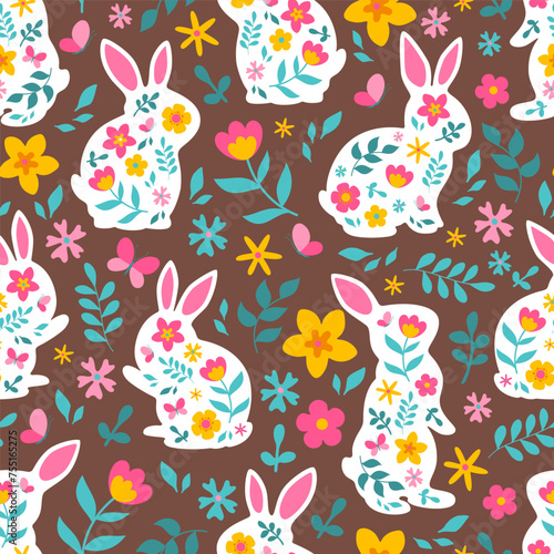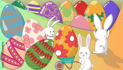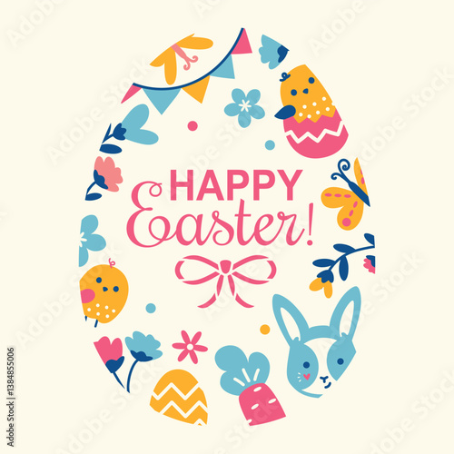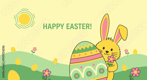Милый кролик с пасхальными яйцами, цветами, векторная иллюстрация в стиле бумажного искусства. Шаблон дизайна поздравительной открытки с Пасхой.