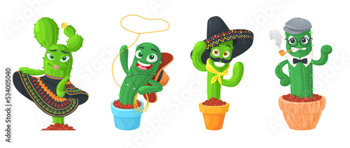 Симпатичная векторная иллюстрация кактуса. Мультяшный садовый набор цветочных растений. Счастливый забавный кавайный сочный персонаж, изолированный на белом фоне. Дизайн цветочного горшка с каракулями. Тропический улыбающийся эмодзи