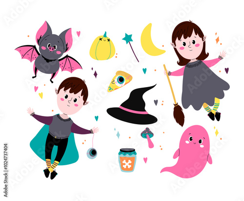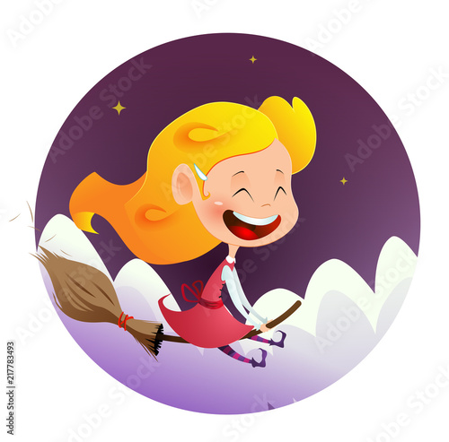 Милый счастливый мультяшный персонаж фэнтези-ведьмы на Хэллоуин в костюме, летящий на метле над полной луной в небе векторная иллюстрация. Канун дня всех святых в осенний сезон