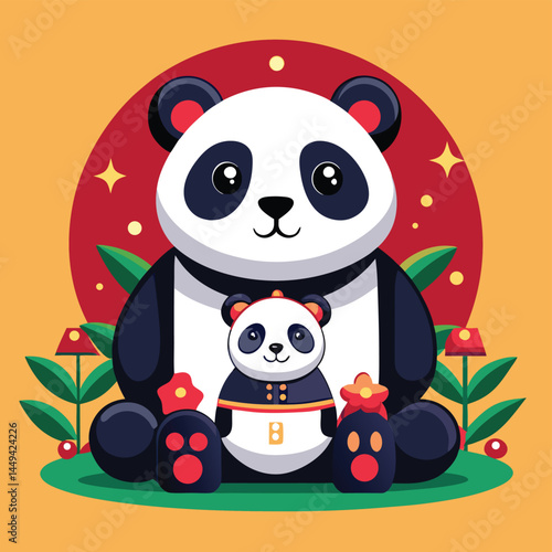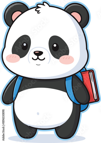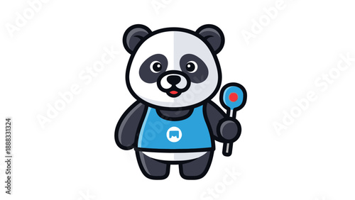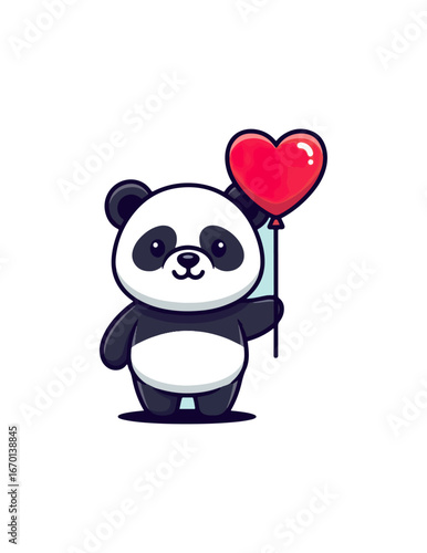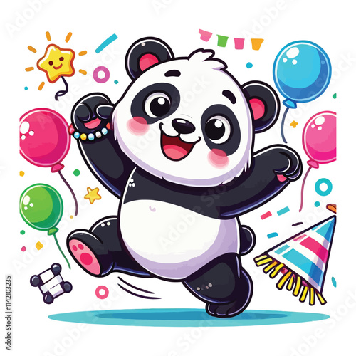 Милый мультяшный вектор панды. Значок животного-медведя. Забавный персонаж-девочка-детеныш со счастливым лицом, бегущий с воздушным шаром в руках, изолированный на белом фоне