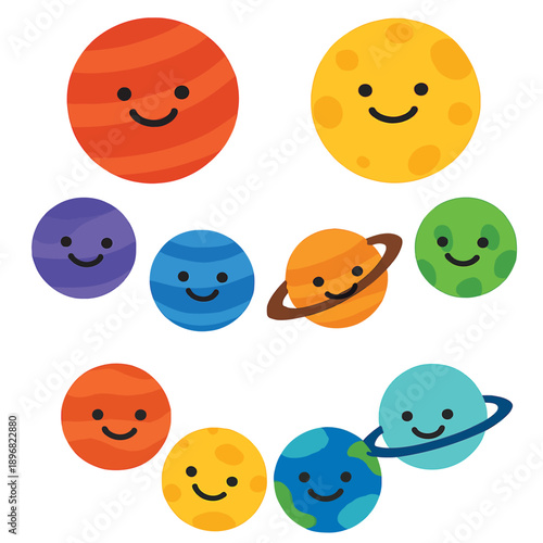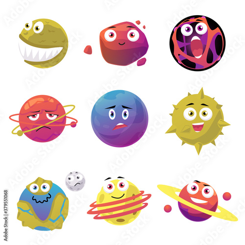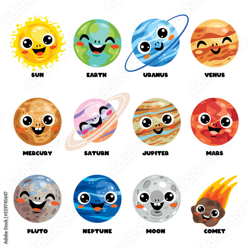 Милые мультяшные планеты Солнечной системы. Вырезанные из бумаги Уран Нептун Меркурий Венера Марс Юпитер Сатурн Земля Солнце Луна с улыбающимися лицами, векторная иллюстрация. Забавный детский эмодзи космической планеты. Детская астрономия.