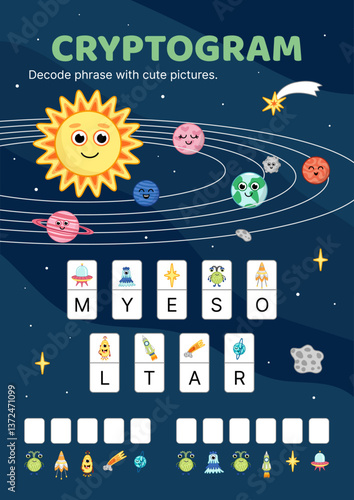 Милые мультяшные планеты Солнечной системы с улыбающимися лицами, векторная иллюстрация. Уран Нептун Меркурий Венера Марс Юпитер Сатурн Земля космические планеты, вращающиеся вокруг Солнца. Детский плакат по астрономии.