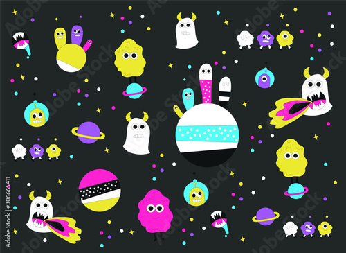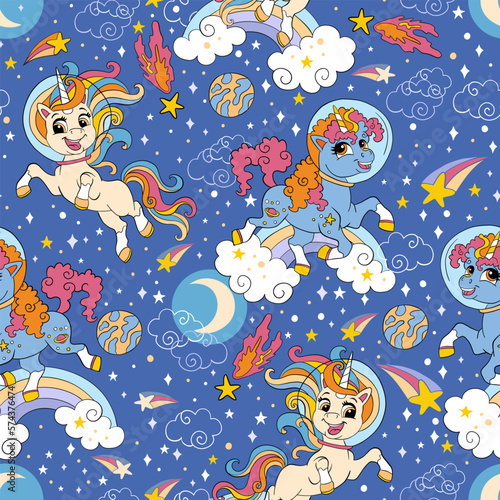 Симпатичные кошки в космическом пространстве вектор бесшовный узор. Креативный дизайн для ткани, текстиля, обоев, оберточной бумаги.